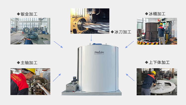 片冰機蒸發器作為片冰機蒸發產冰的組件,是機器產能及產冰質量最重要的部件。森德制冰具備多年的片冰機設計和生產制造經驗,根據客戶的用冰需求,我工廠可單獨代工蒸發器單桶??蛻艨善ヅ渥杂械闹评錂C組,進行安裝調試,滿足生產需求。